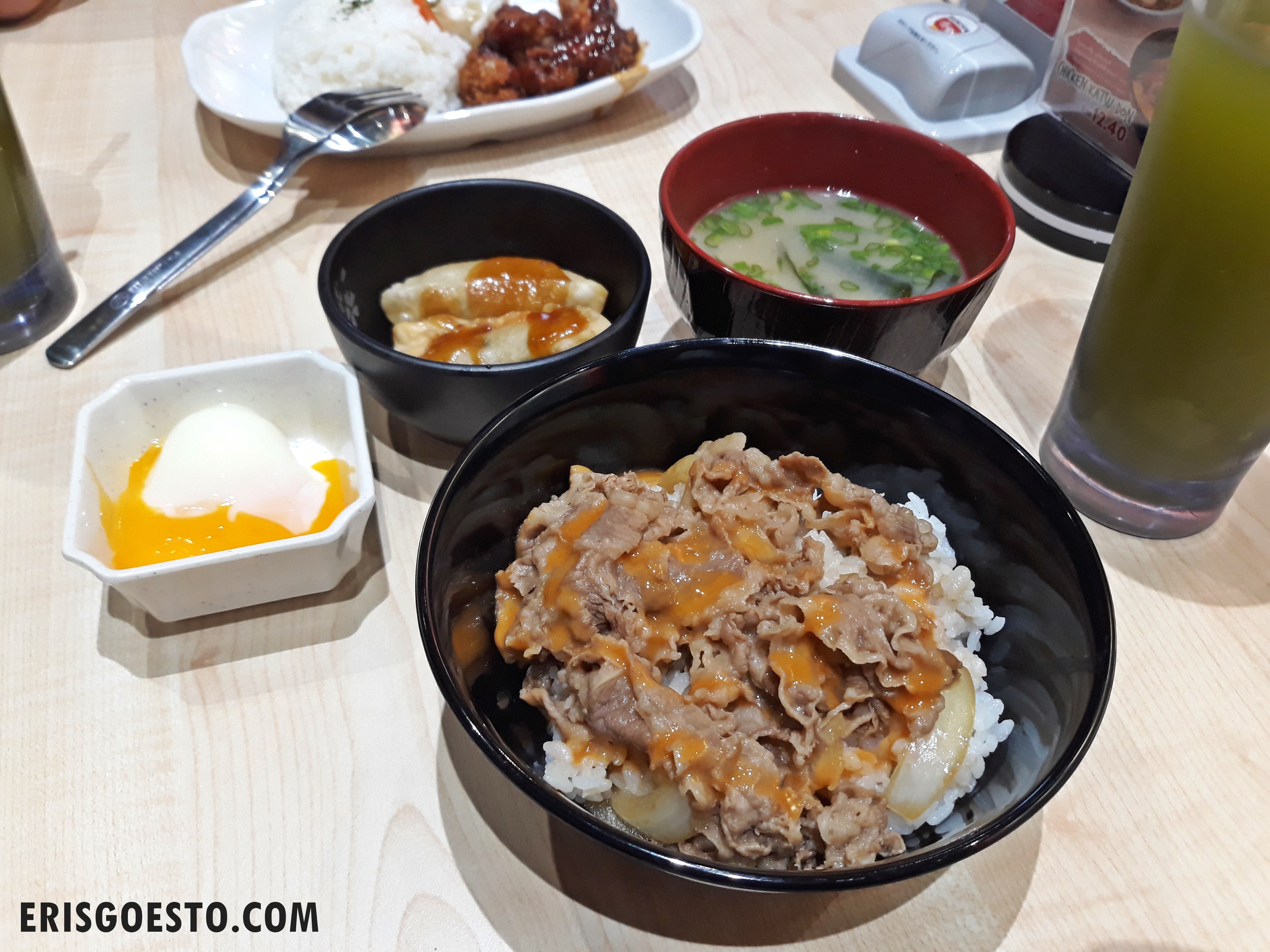 I ordered their signature beef bowl aka Spicy Ontama Gyudon, which came with a generous serving of thinly sliced beef over rice. For its price, the beef quality was good, although I don’t know where ‘spicy’ came in because it had zero spiciness. Nice ratio of onions. The onsen egg was served separately. Added on a ‘set’ with a side of chicken gyoza, miso soup and tea, for mum, coz she eats like a bird.