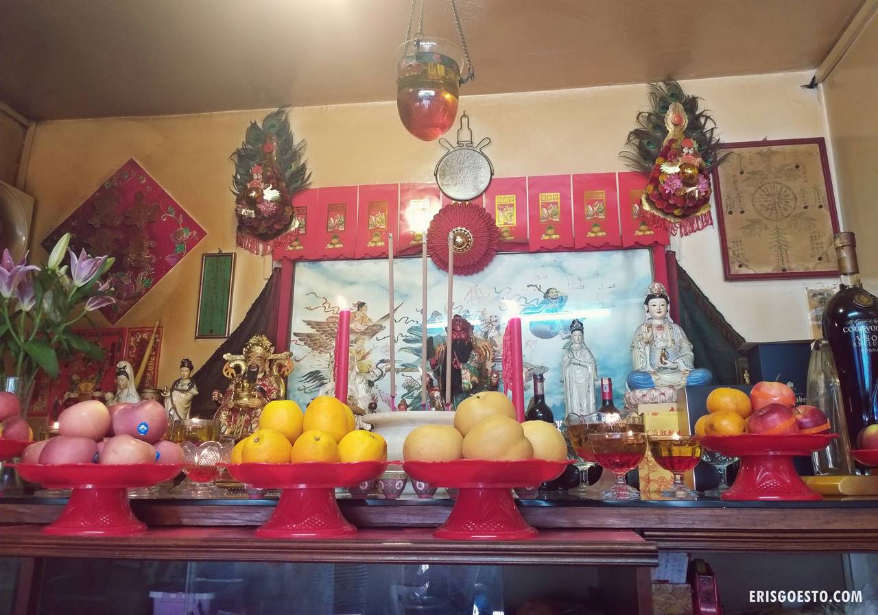 The place didn’t look much like a temple, aside from baskets of paper offerings in a corner. There were several couches at the waiting area and a large wooden altar with Buddhist and Taoist deities. I recognised the main one as Guan Yu, the general-god, and Guanyin. The altar was furnished with the usual trappings; platters of fruit, oil candles, a reflective mirror (for repelling evil spirits) and a tapestry depicting heavenly scenes.