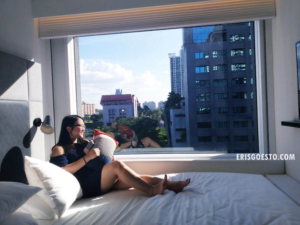 Our room is small but cleverly designed and furnished to make it look more spacious – almost like a studio apartment. The platform bed is flush against the window, with blinds for privacy and to shield against the sun. Both the bed and the pillows are extremely comfy – not too soft (which tends to give me back aches) nor too rigid. Of course, the view of the street is awesome – I feel like I’m in New York, surrounded by towering skyscrapers!