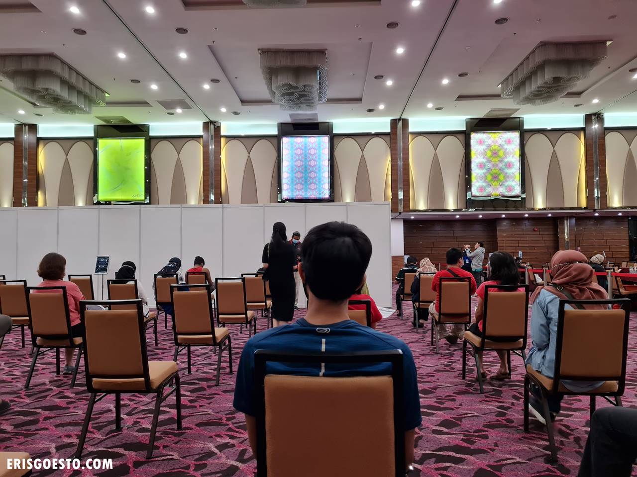 6.45PM: After scanning my temperature and checking in on the MySejahtera app, I followed the signs up the escalator to the 7th floor. There, ushers directed me to the first waiting area outside the hall. We sat for about 10 minutes, and once the area had filled up with people, staff members gave us two forms. There was a slip clipped to the top with a number and QR code.