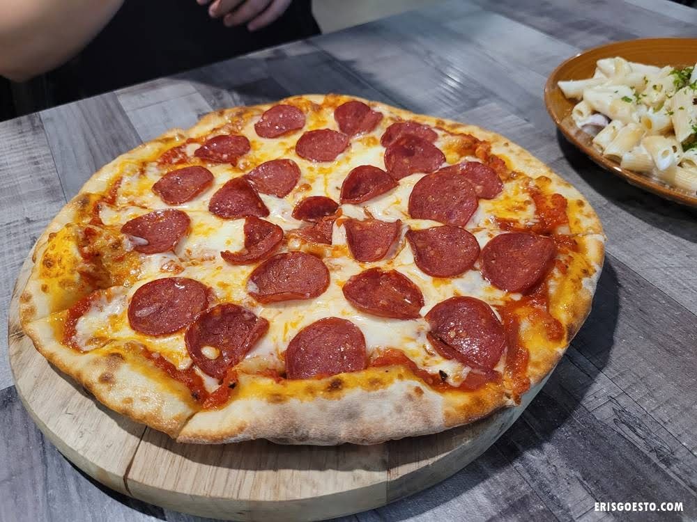 And here’s what we ordered! Beef pepperoni pizza for the Hubs, a penne carbonara for me, and truffle fries for sharing.